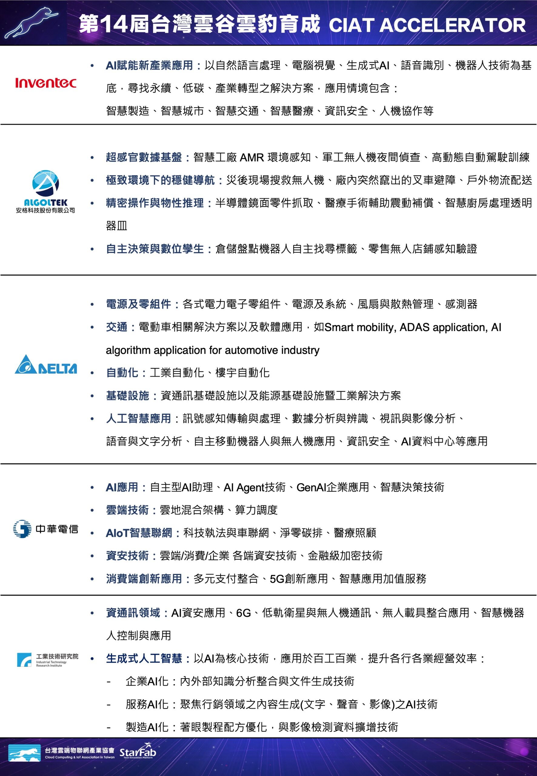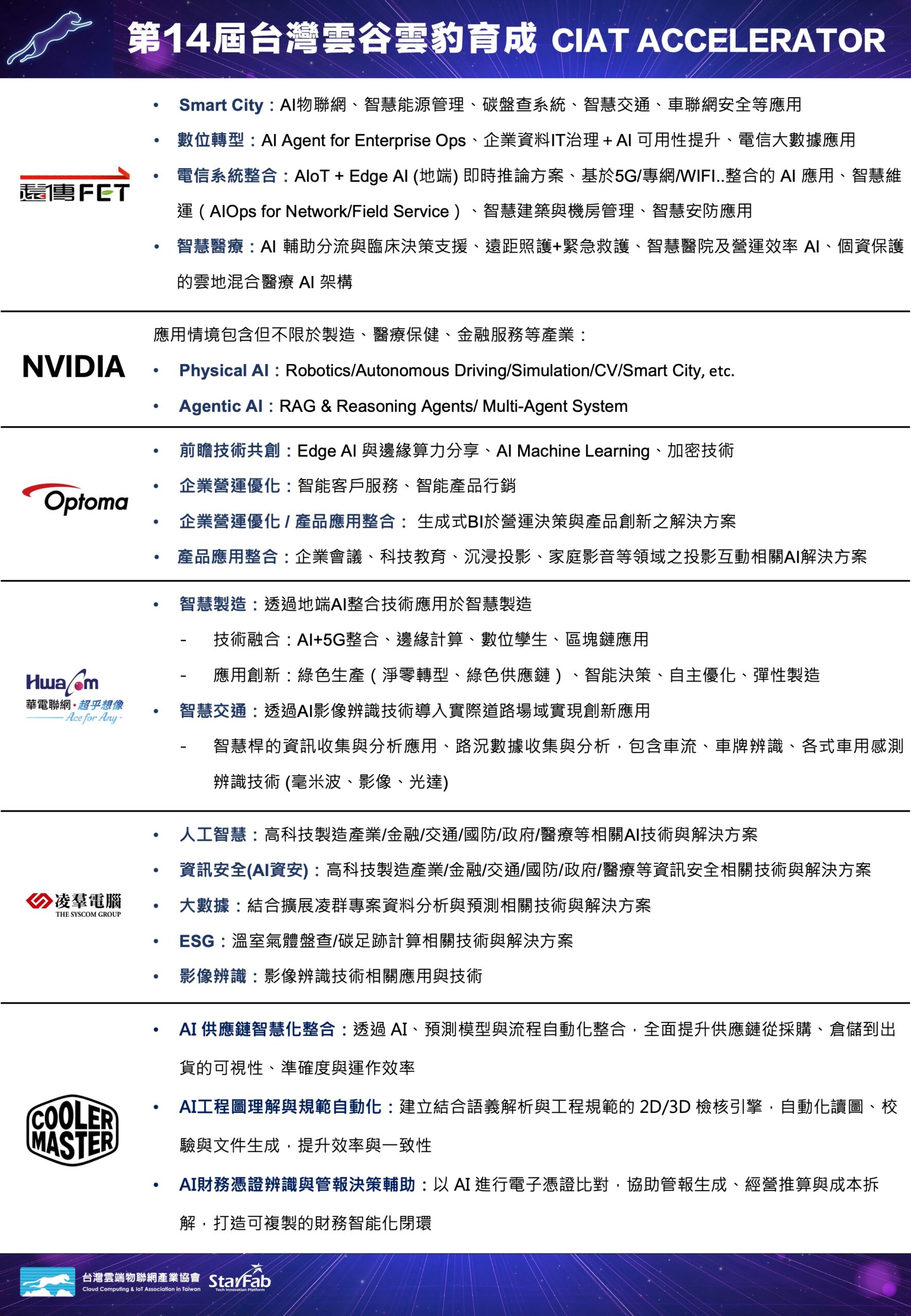 第14屆台灣雲谷雲豹育成企業出題說明會將於 2026 年 4 月 1 日正式登場,誠摯邀請關注產業創新與新創合作的夥伴一同參與!本屆攜手指標企業「遠傳電信、NVIDIA、奧圖碼、華電聯網、凌群電腦、Cooler Master、英業達、安格科技、台達電子、中華電信、工研院」聯手出擊,引領科技新創找準市場座標,加速拓展全球版圖。